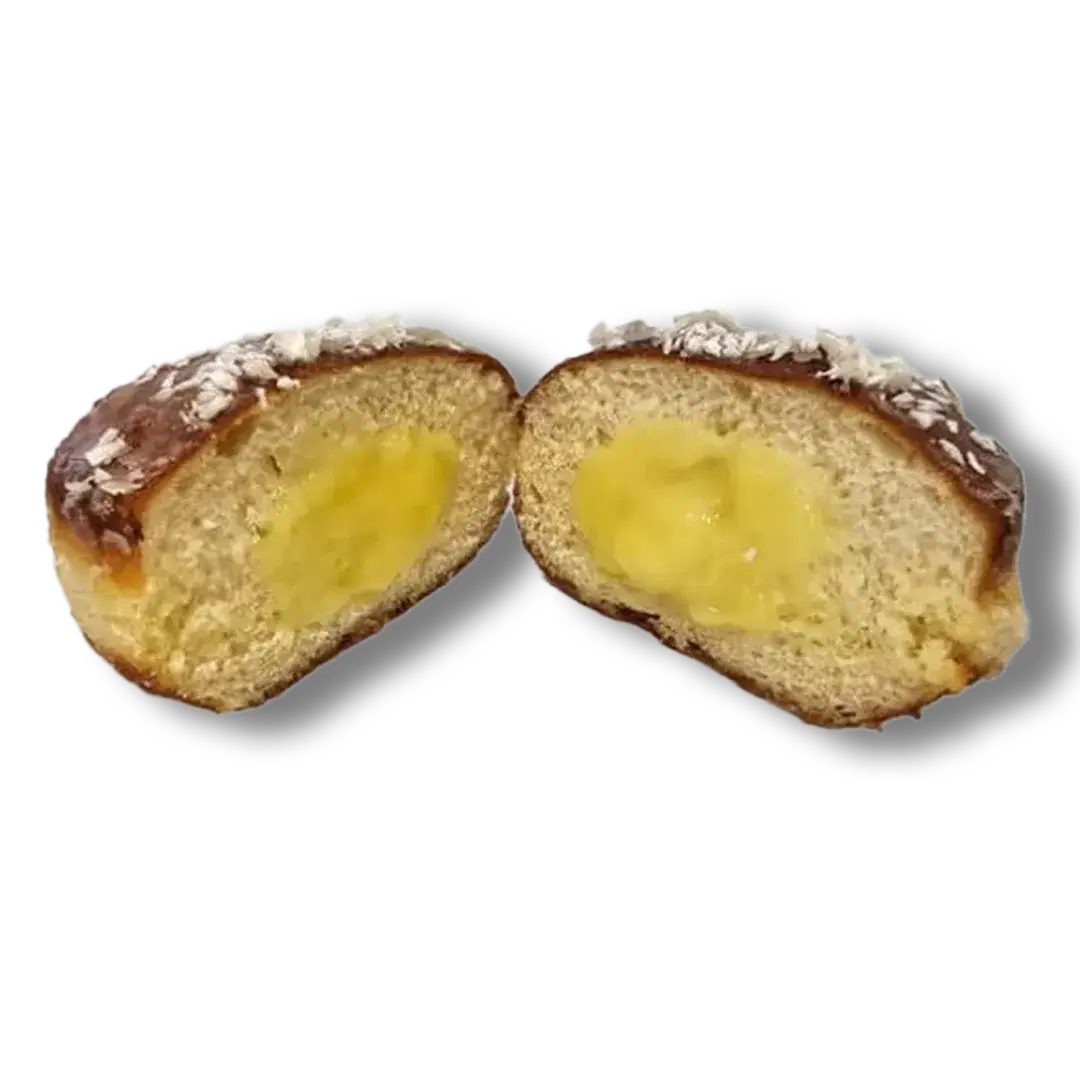 Traditional soft dough doughnut made with with a custard cream filling, glazed with icing, and sprinkled with coconut flakes
